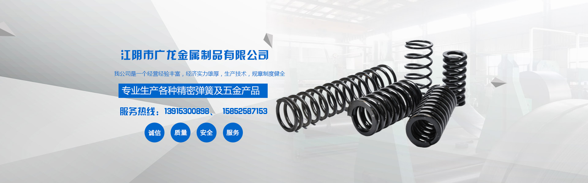 江陰市廣龍金屬制品有限公司,位于風(fēng)景美麗的江陰市。我公司是一個(gè)經(jīng)營(yíng)經(jīng)驗(yàn)豐富,經(jīng)濟(jì)實(shí)力雄厚,生產(chǎn)技術(shù),規(guī)章制度健全,服務(wù)多元化,產(chǎn)品多元化,產(chǎn)品質(zhì)量高的金屬制品公司。主營(yíng)產(chǎn)品:電動(dòng)工具彈簧、各類化妝品噴霧壓簧、各類異形彈簧、化妝品瓶蓋配重彈簧、精密儀器壓簧、卡簧、拉簧、扭簧、塔簧、油封彈簧、座椅掛鉤等彈簧兼容行業(yè)多的綜合性公司,如果您對(duì)我公司的產(chǎn)品服務(wù)感興趣,請(qǐng)?jiān)诰€留言或者來(lái)電咨詢,聯(lián)系電話:13915300898!